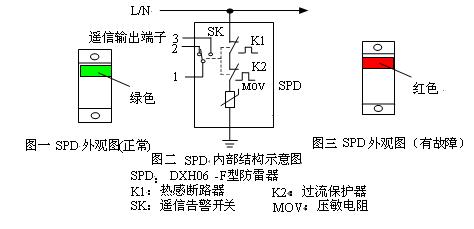 当线路感应过大雷电流时,过流保护器(K2)迅速断开,保护电源电路工作不受影响。K1或K2动作后,SPD内脱扣装置动作,使故障显示窗口显示红色(如图三所示),提醒用户更换SPD模块,同时,脱扣装置带动遥信告警开关(SK)动作,输出故障告警信号。